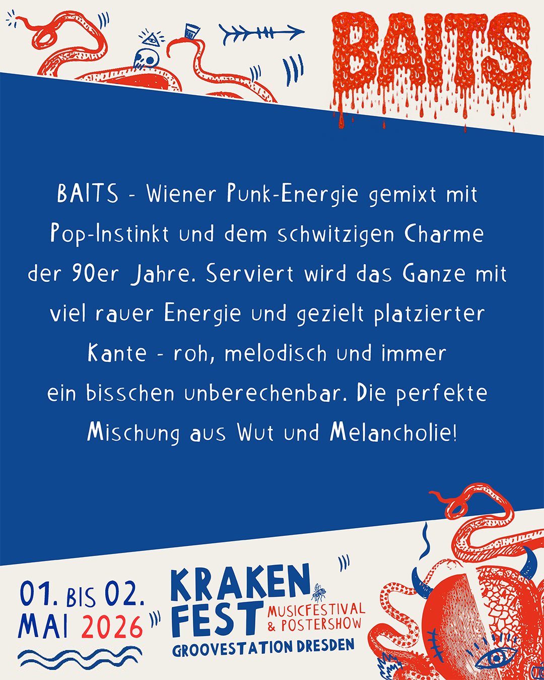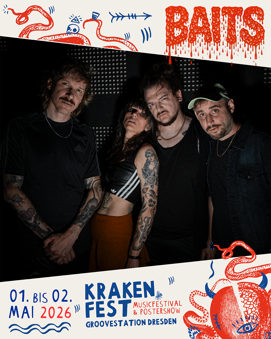 01. – 02.05.2026 KRAKENFEST – Krakenduft Records und Freunde laden in die GrooveStation Dresden zum KRAKENFEST 2026 ein. Mit dabei sind DYSE, HECKSPOILER, BAITS, 13SUNS, TOURDEFORCE, PAULINCHEN BRENNT, CEEBRA und HI MUM. Parallel zum Festival gibt es eine Postershow von THE RAW STUFF. Nationale und internationale Künstler*innen zeigen ihre Werke in der GrooveStation Dresden. Kommt vorbei!